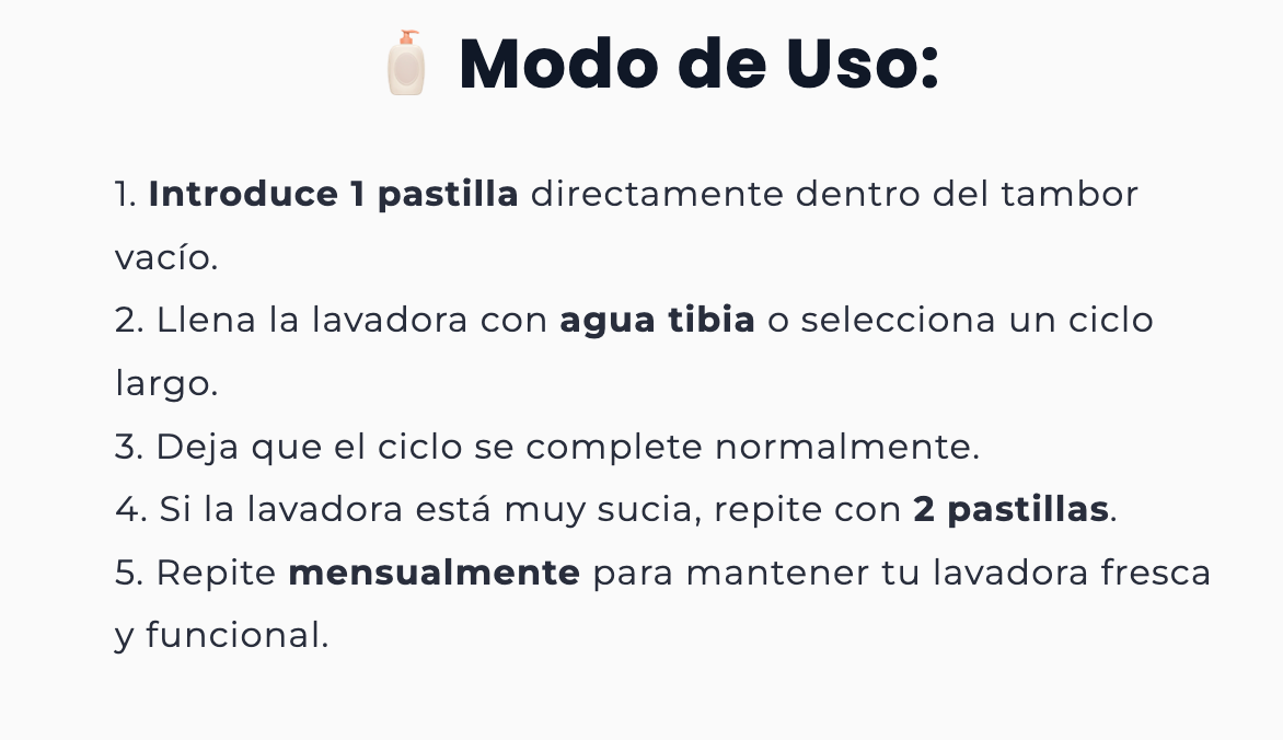 Se recomienda usar 1 o 2 pastillas una vez al mes o cada 20 lavados